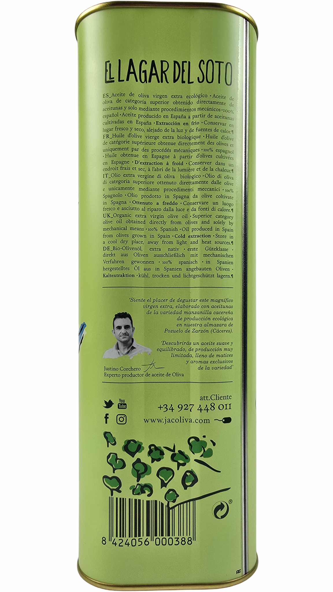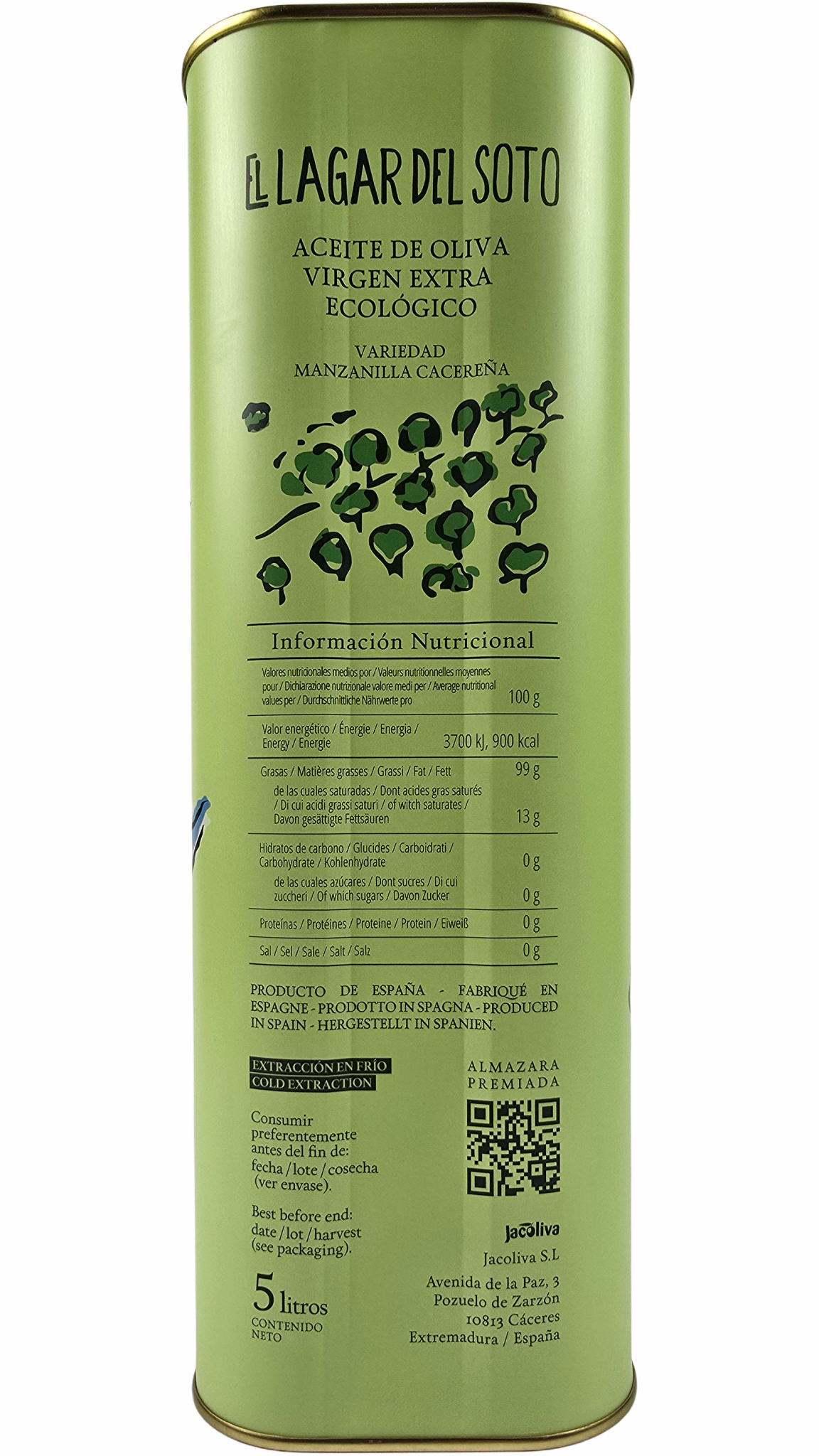 - Natives Olivenöl Extra, hergestellt aus Oliven dessen Bäume als Bio-Olivenbäume der Sorte "Manzanilla Cacereña" eingetragen sind. Das Produkt ist C.R.A.E.X. (Aufsichtsbehörde des ökologischen Landbaus in der Extremadura), nach europäischen Standards zertifiziert.