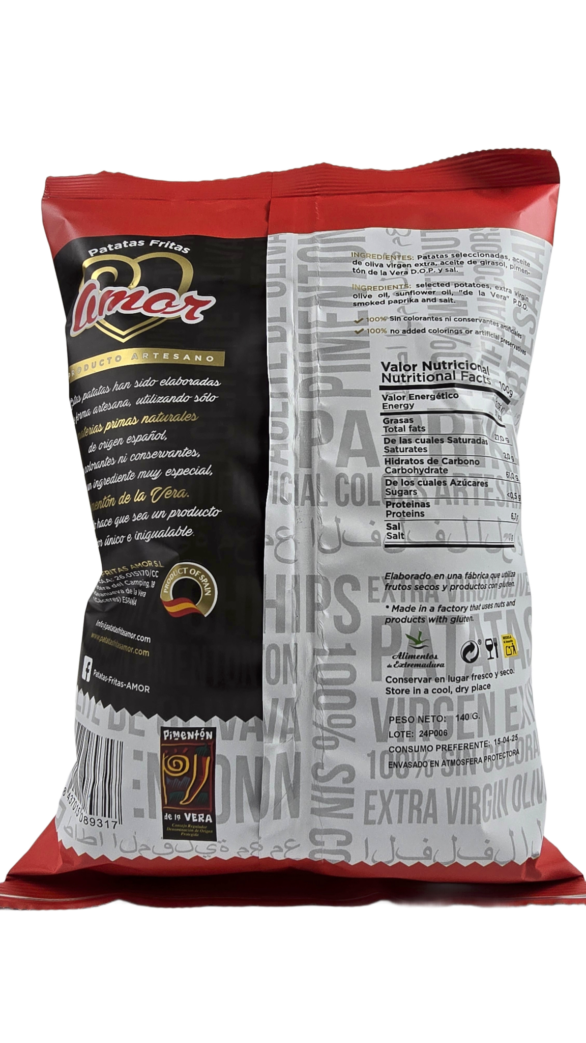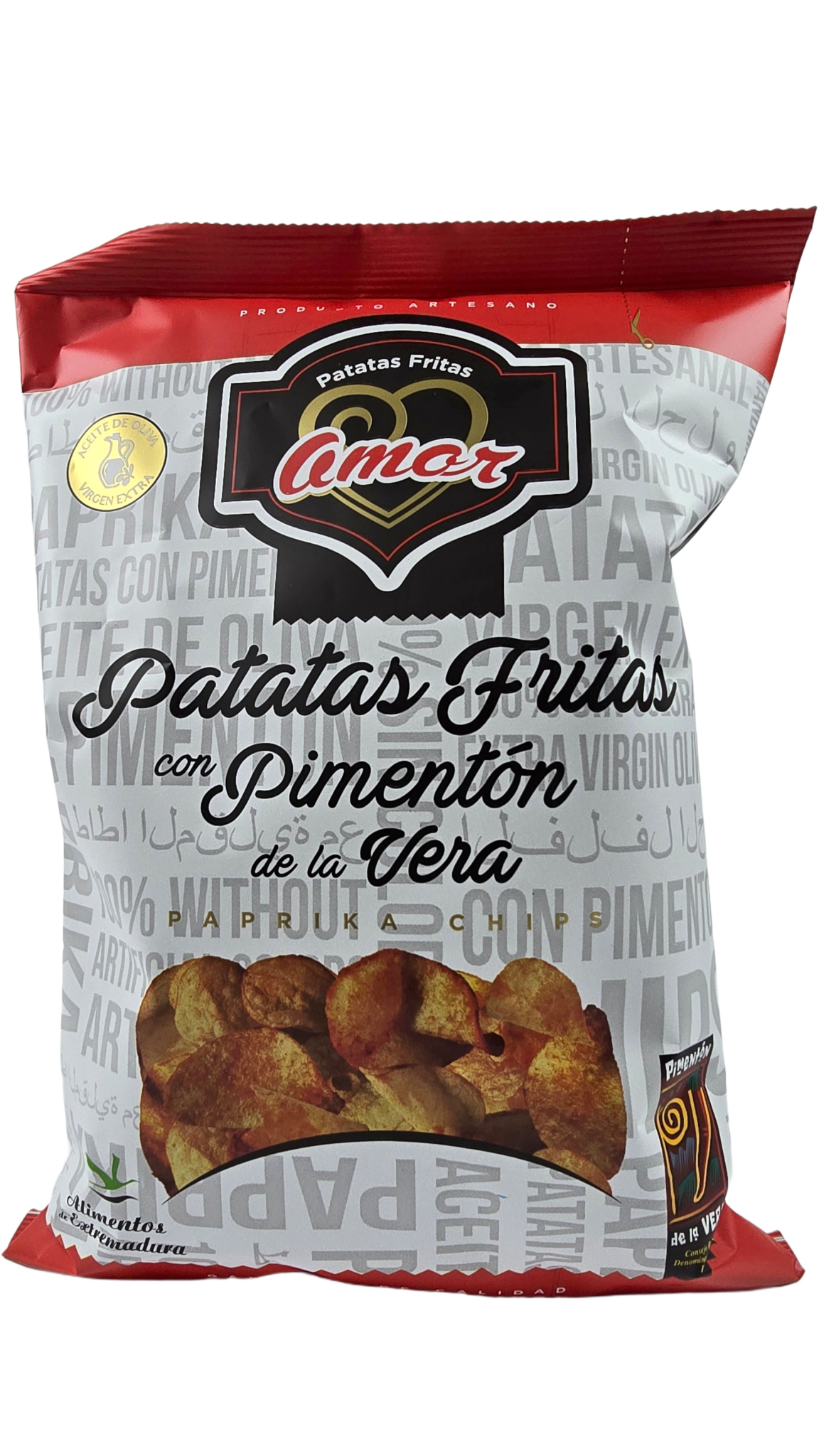 Diese Kartoffeln wurden auf traditioneller und handwerklicher Weise hergestellt, in einer Pfanne gebraten und von Hand auserlesen. Hinzugefügt wird ein wenig Salz und eine authentische und originelle Zutate hinzu: PIMENTON DE LA VERA D.O.P.