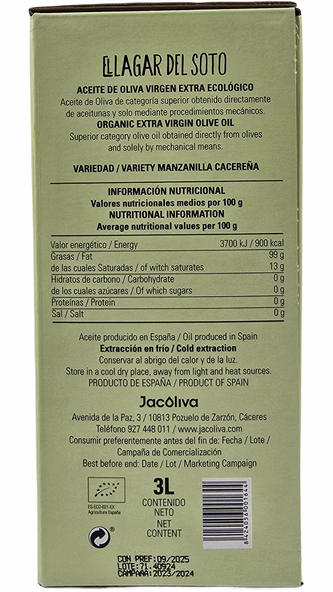 - Natives Olivenöl Extra, hergestellt aus Oliven dessen Bäume als Bio-Olivenbäume der Sorte "Manzanilla Cacereña" eingetragen sind. Das Produkt ist C.R.A.E.X. (Aufsichtsbehörde des ökologischen Landbaus in der Extremadura), nach europäischen Standards zertifiziert.